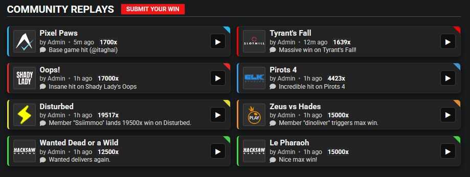 We've added a new widget to showcase recent big win replays submitted by the community. You can find it on the front page - just scroll down a bit and you'll see it among the latest highlights.