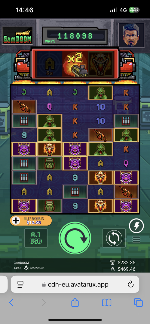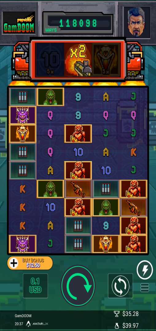I really like this game. Normally Pop games are only good for a couple minutes for me, but this one I played a lot. Love the old Doom theme. The basegame can get hit big with the features on top and the bonus is super exciting. A lot can happen if you upgrade the screen size, which makes every spin from there very exciting. If you get multiple gun multipliers and linked reels you are in for something big. The extra bet options are really nice too. I love the super mode one with extra high multipliers. All in all definitely will play this again.