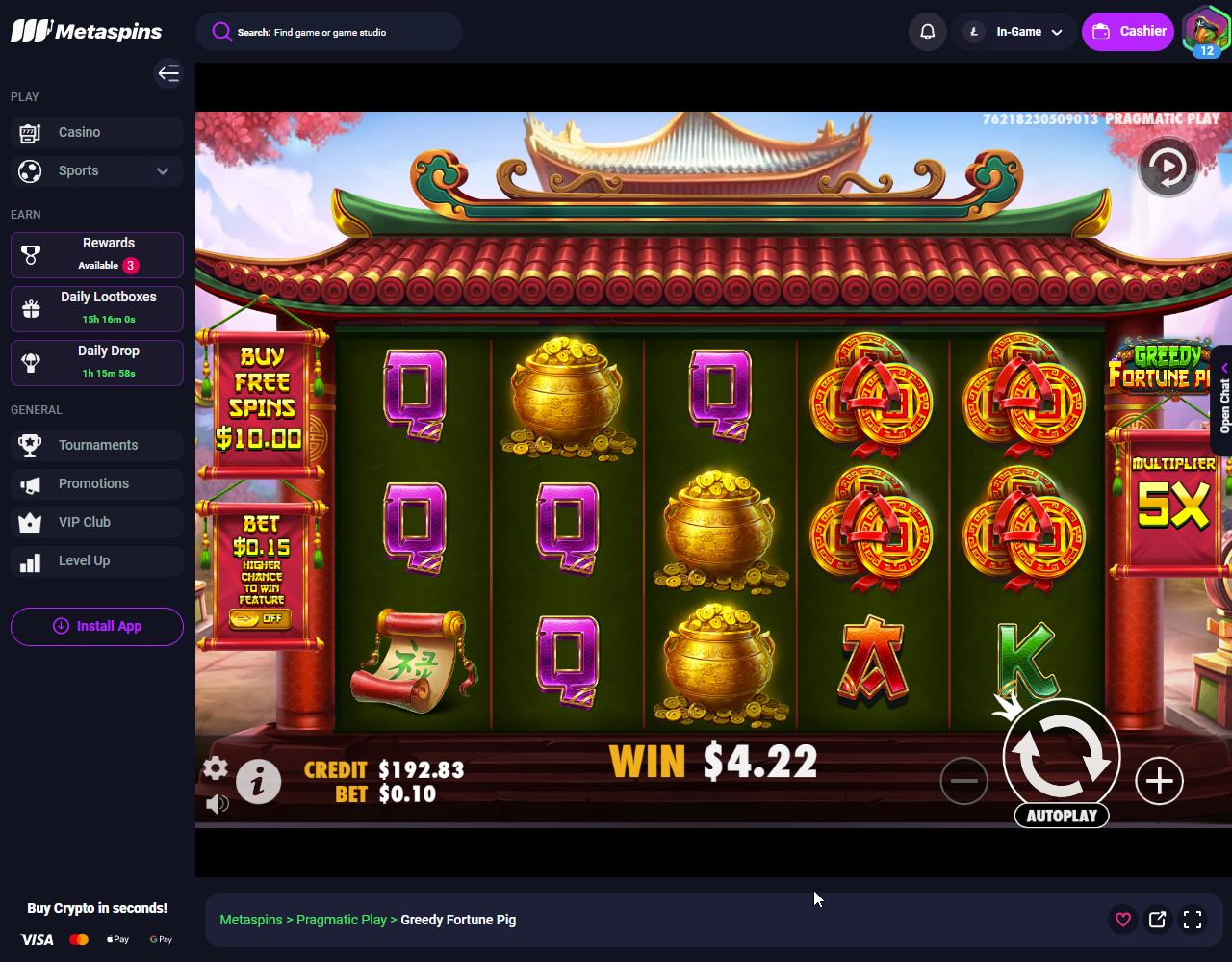 Seems like a very low volatile slot, I didn't understand how to acquire multipliers in the bonus until I got that special pig and i can see getting multiples of him in the bonus would pay big. Although it's pretty weird that 5926x is the max win amount very odd number. I never managed to grab the multiplier pig if he even exists in the base game and i never saw any massive coins, I guess i wish there were bigger value coins.