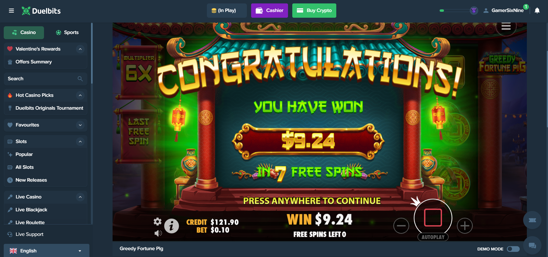 Feedback: Decided to buy bonus on demo and it paid me 8x. Feels rather than reel kingdom than pragmatic. That's not my type of game, i want to have fullscreen wilds or big win collector. The mix of it it's just meh, don't like it.